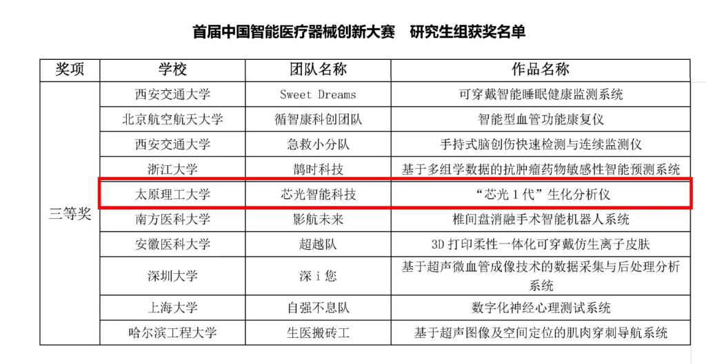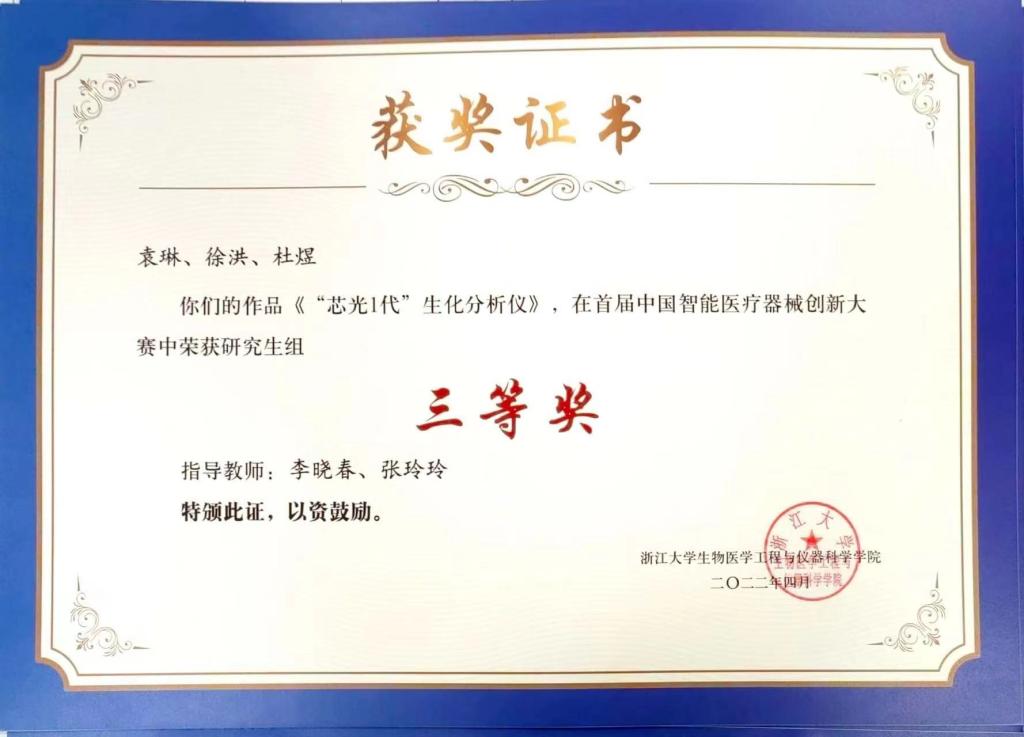 suncitygroup太阳集团李晓春教授、青年教师张玲玲博士指导的芯光智能团队参加了决赛,项目围绕智能医疗器械研发和产业领域存在的问题,运用相关专业知识,做出具有新颖性、可行性和实用价值的参赛作品《“芯光1代”生化分析仪》,最终荣获三等奖。于2022年6月3日收到获奖证书。